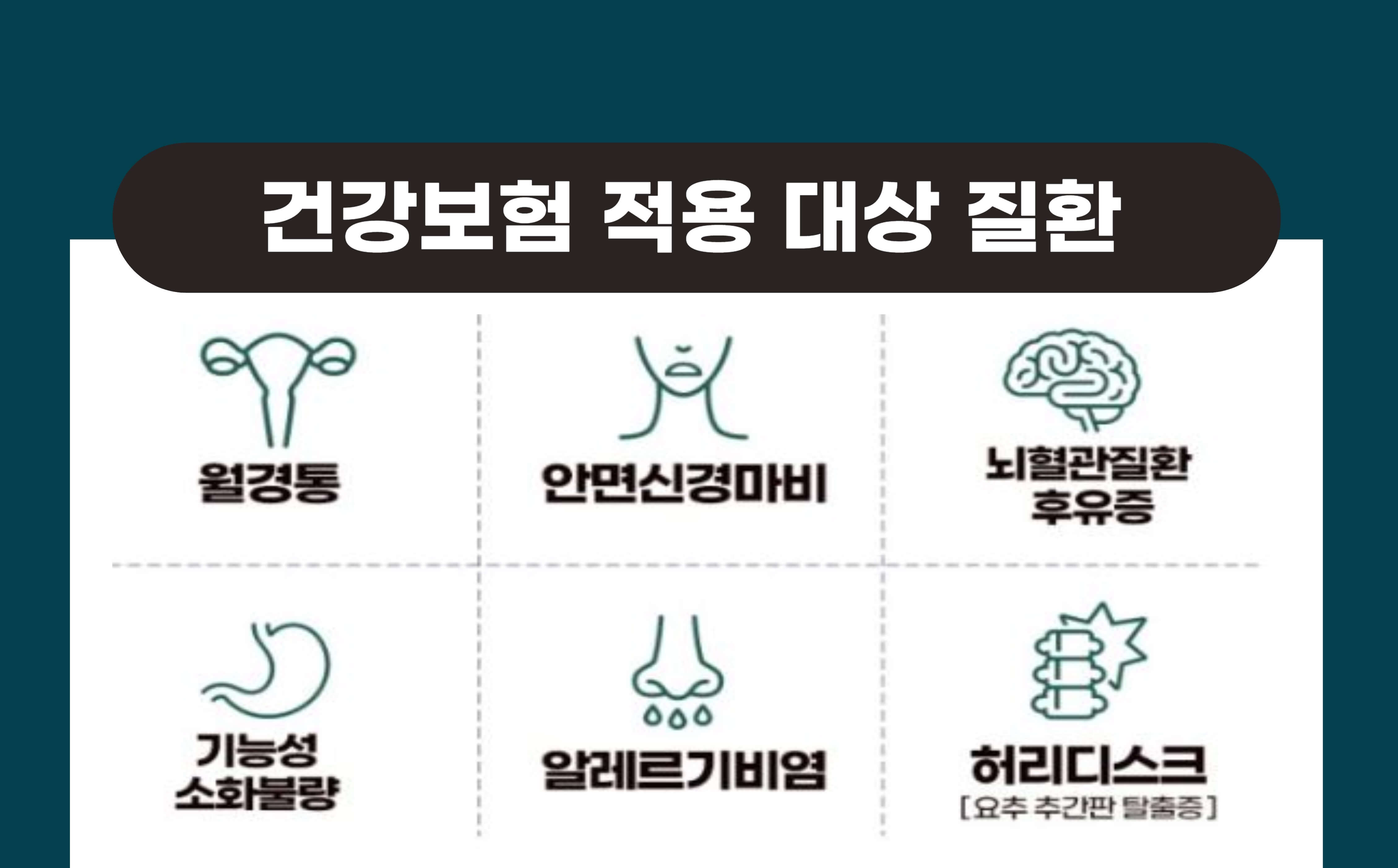 첩약 건강보험이 적용되는 대상 질환은 요추추간판탈출증, 안면신경마비, 뇌혈관질환후유증, 월경통, 알레르기비염, 기능성소화불량으로 대상질환에 대해 한약 처방시 건강보험을 적용받을 수 있습니다.